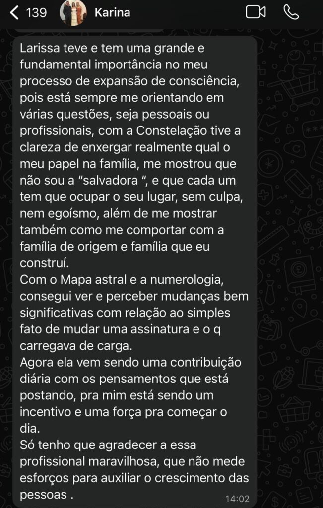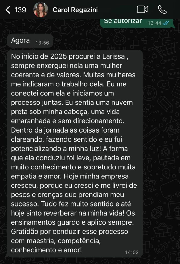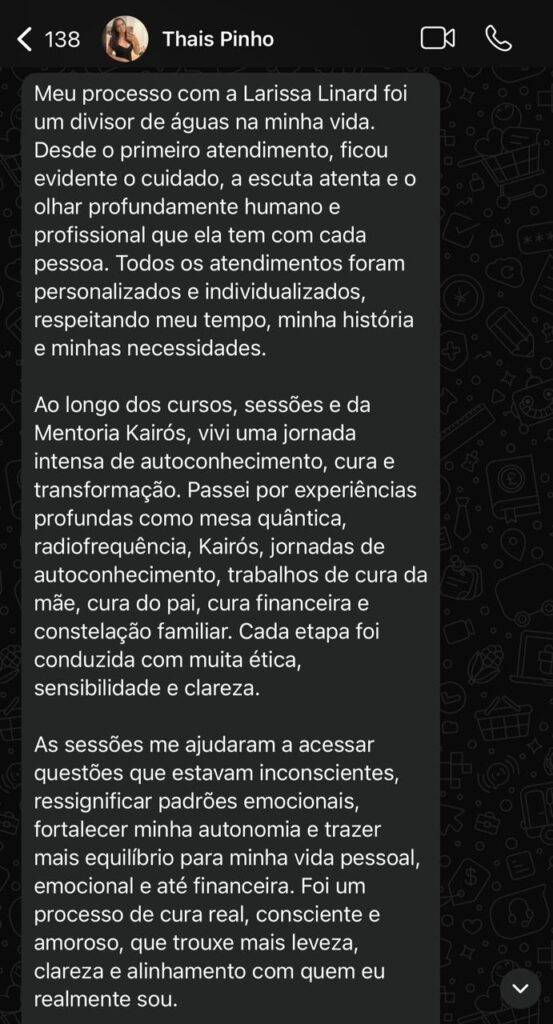 Unindo constelação sistêmica, reprogramação emocional e leitura de padrões, Larissa já conduziu inúmeras mulheres a romperem ciclos de escassez, dependência emocional e sabotagem financeira, reconstruindo sua relação com dinheiro, valor pessoal e identidade.